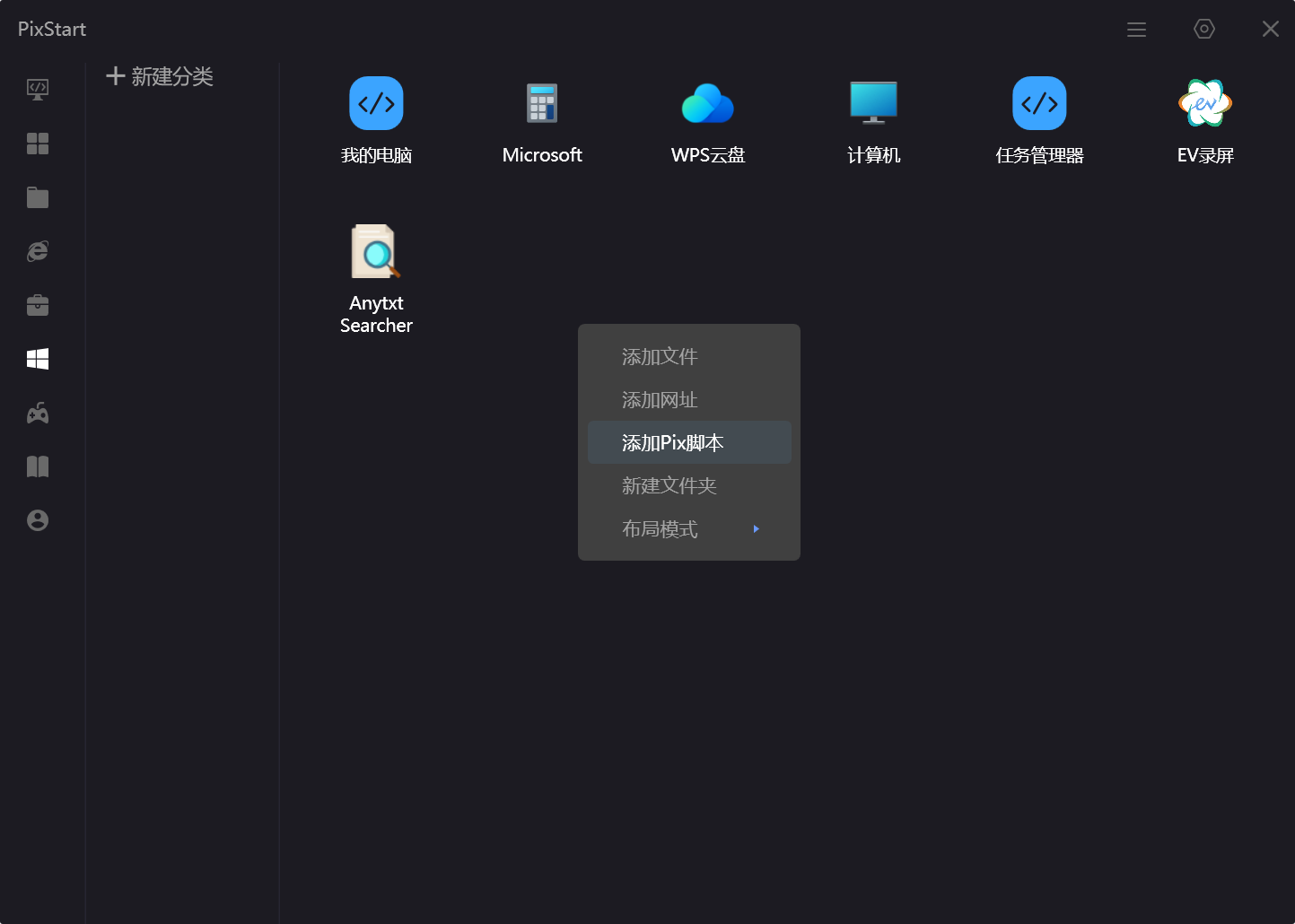 之前说做一个bat文件拖入进来也可以实现这些功能,但是打开速度太慢了,所以为了高效以及扩展性则推出了Pix脚本的功能 , 在主窗口空白处,鼠标右键->新建Pix脚本就可以了