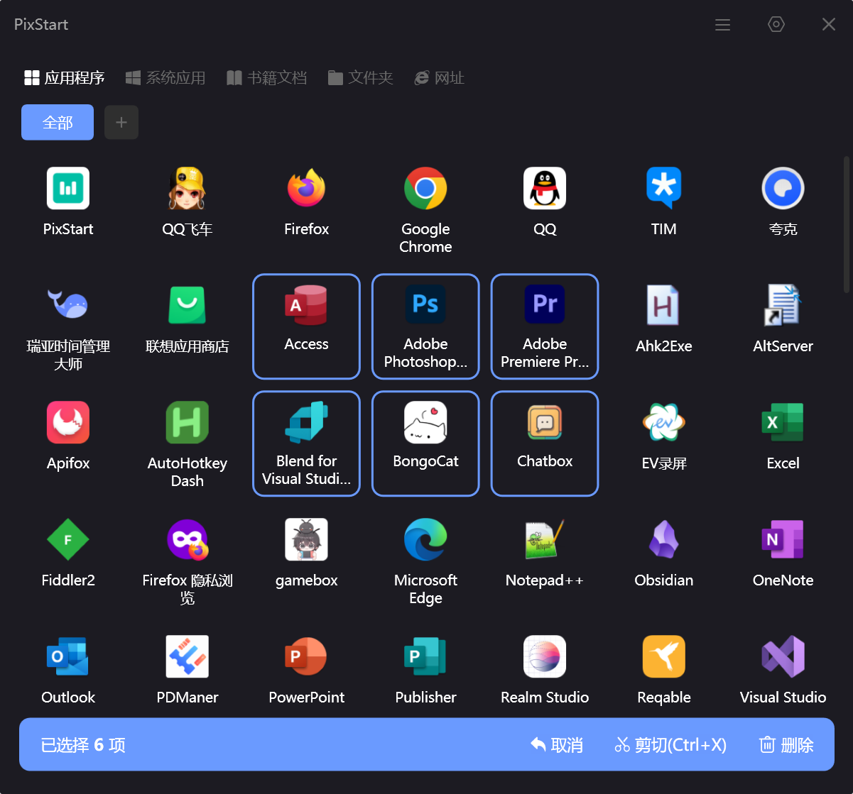 按住Ctrl+鼠标左键点击,即可开启批量选择模式,然后通过下方的剪切功能,把这些选中的项目剪切到其他分类中粘贴就可以了,比起一个一个拖动要便捷很多