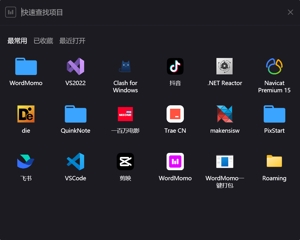 如你所见,你甚至都不用主动搜索某个软件,因为查询面板默认会根据你打开软件的频率自动排序出最常用的一些